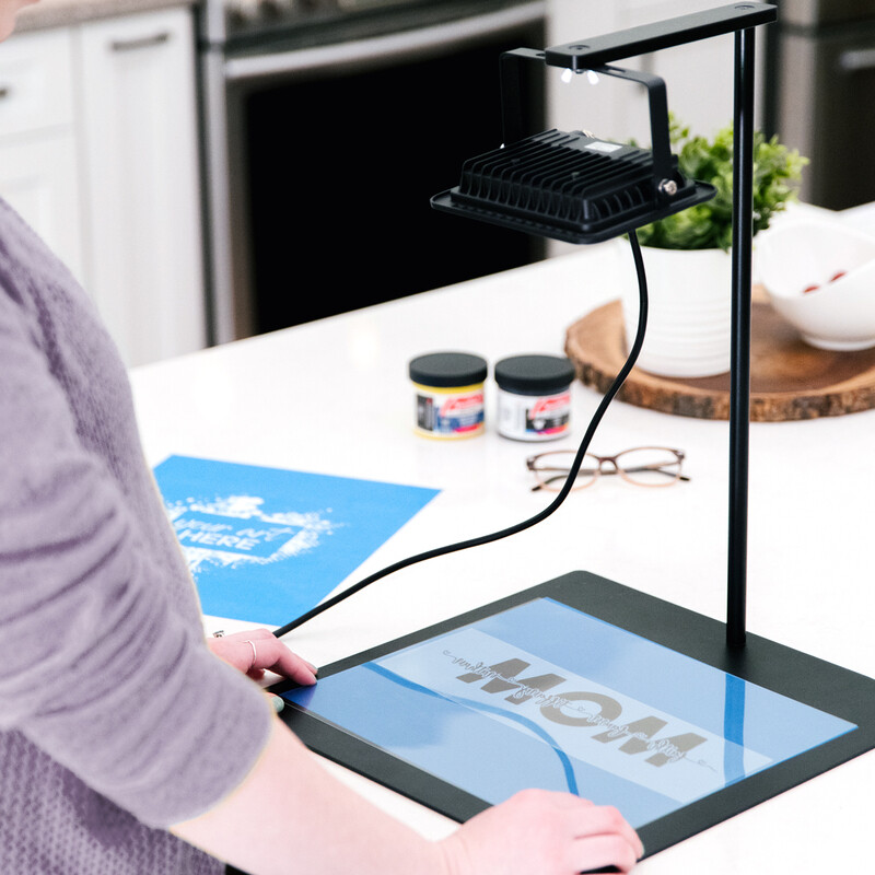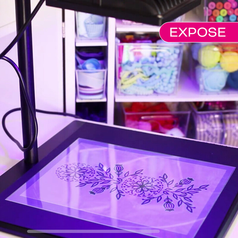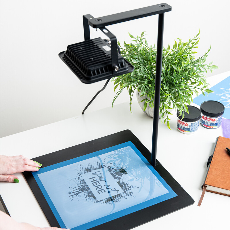 2. EXPOSE – Expose your printed image onto the Ikonart Stencil Film using the exposure stand and UV LED light that come in the kit. Exposure time is 35 seconds using the Ikonart light stand.